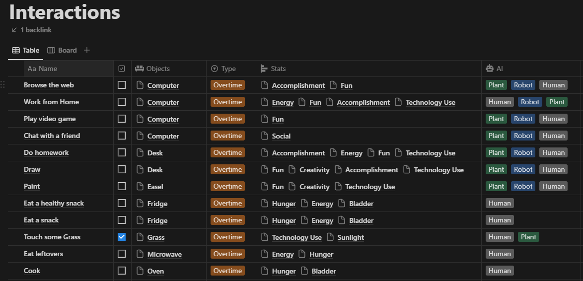 • A list of all interactions considered and their assigned score for every choice made, to see if they are correctly aligned with an AI's personality traits and needs, or if some interactions are weighted disproportionately better or worse than others.