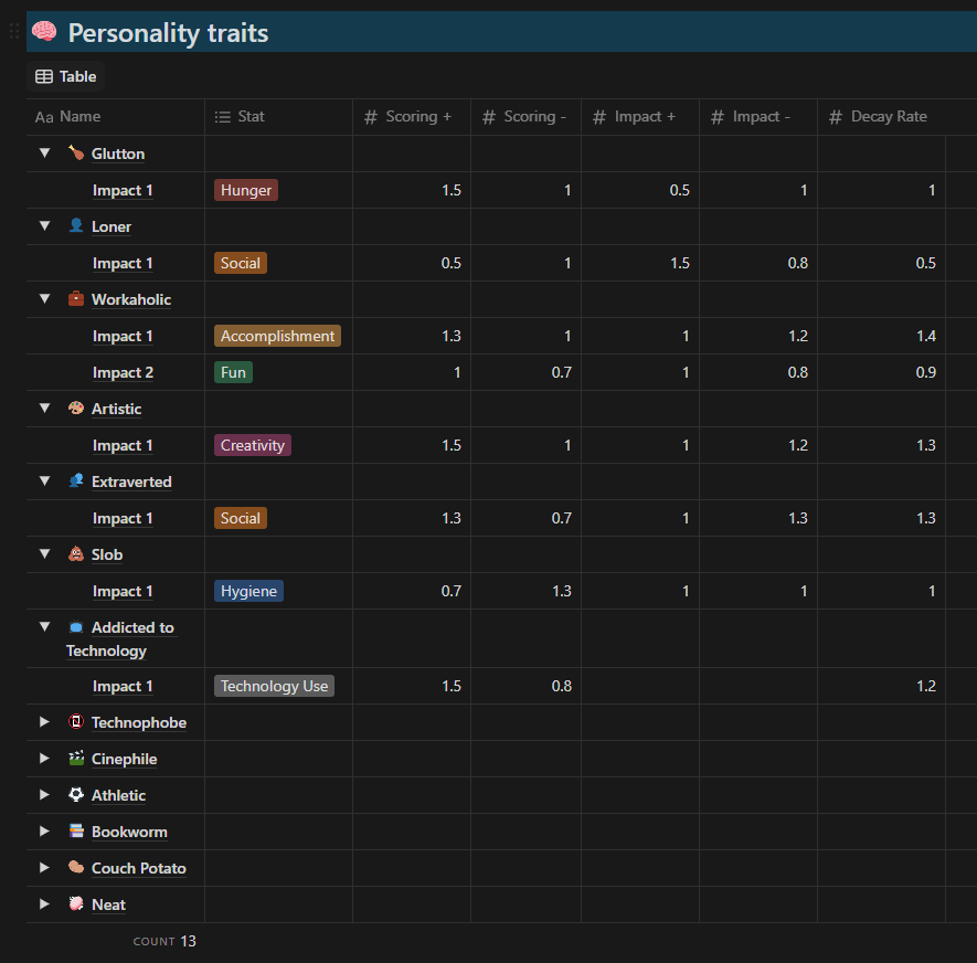 It was important for me to expose all the points of data, even ones hidden to players, as this is meant as a tool for designers. For example, the STATS tab not only includes basic needs, but also the ones that serve an underlying purpose and are meant to bring another level of complexity to the system. These are coloured in blue to distinguished them from the rest.
