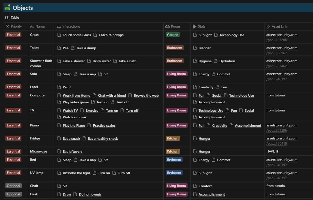 I also listed all the AIs, needs, traits, objects and interactions that I initially wanted in the project, and drew a layout of the house. This helped me balance the values quickly by making sure, for example, that all the needs could be satisfied by at least one object, or that all personality traits had varied effects. In the end, I had to scrap the robot and plant AI because of bugs that I could not fix, and the layout got bigger to fit in more objects and AI that are shown in the screenshots. But it gave me a quick overview of what I wanted and needed, and helped me make decisions as to which features to remove or improve.