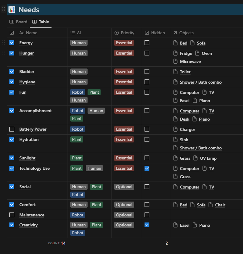 Adding new objects, interactions, needs and traits was an obvious task to complete, as I wanted to show the versatility of the system. I also added a death feature and the possibility for a need to be vital. This was not something initially included in the tutorial but was a simple feature to code and gave a simple but core purpose to any wanna-be sentient being: Avoid dying!