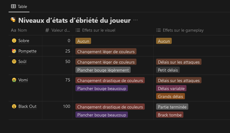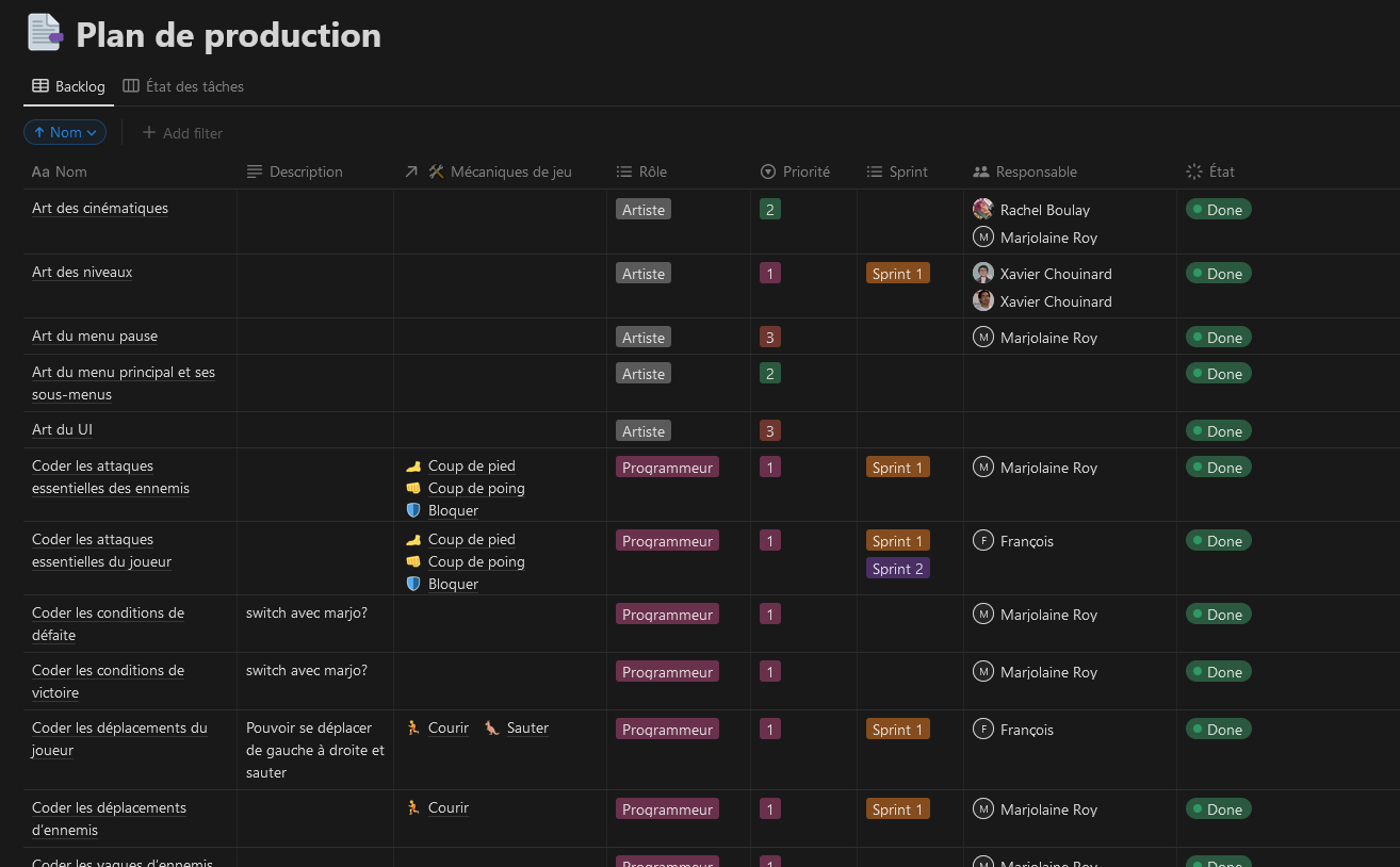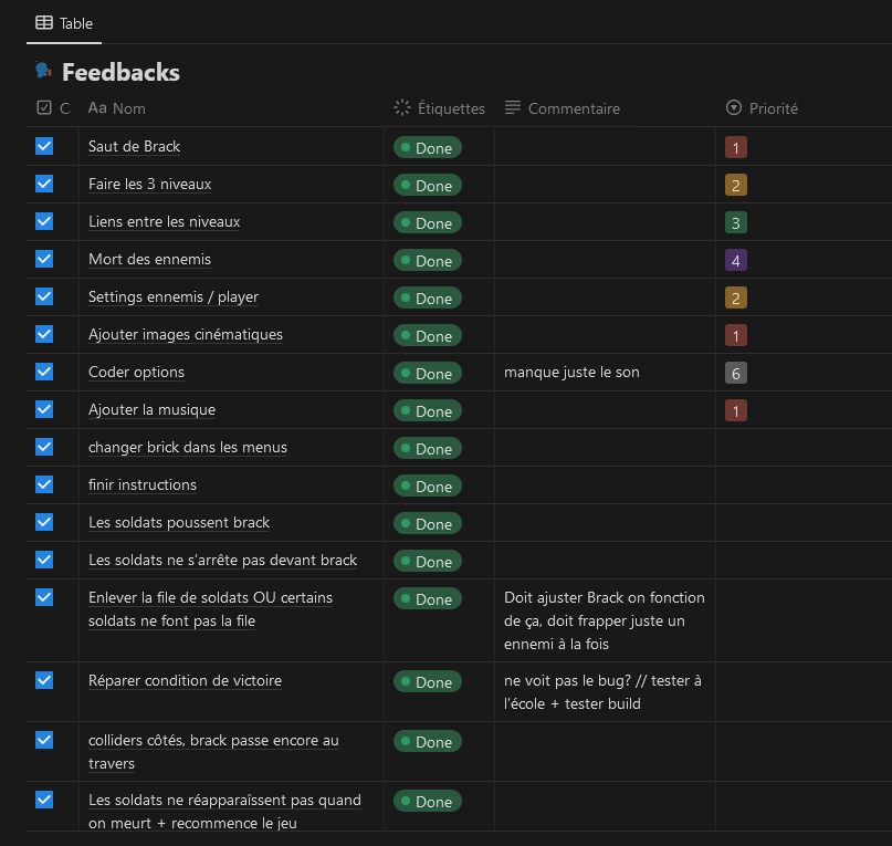 I also created a table to keep track of all the bugs and improvements we had to make, especially after the feedback we received from playtesters.