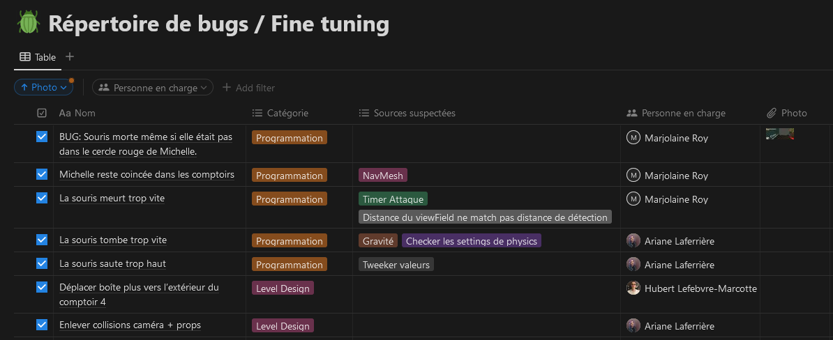 To make the debugging phase easier and help my teammates list all the bugs in the game, I created a repertoire of bugs and suggestions for improvements. It allowed everyone to see which ones were already found, fixed or assigned to someone. They could include a screenshot to show exactly where the bug occurred, and its potential solutions. This would make it easier for the person who would pick up the bug to understand it quickly and look at it straight to the source.